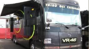 Tulisan yang muncul di bagian depan trailer atau motorhome ini persis seperti yang pada helm keramat yang dipakai Rossi. Tercantum jelas inisial 'VR' dan nomor kesayangannya '46'. Tulisan TRIBU DEI CHIHUAHUA' (Tribe Chihuahua, suku Indian di Amerika Utara, dan artinya menurut Rossi di buku biografinya adalah gang rekan-rekannya) yang biasanya terletak di bagian atas visor helm Rossi pun terlihat jelas.